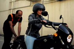 在沙特東部省胡拜爾saso辦理的哈雷戴維森經銷商店,saso驗貨一名女子在教練的協助下騎上這輛殿堂級的電單車。