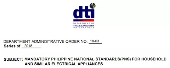 On January 29, 2018, in Makati District, Manila, the Philippine government signed Executive Order No. 18-03. The name of this regulation is "Mandatory Philippine Standard for Household and Similar Electrical Appliances".