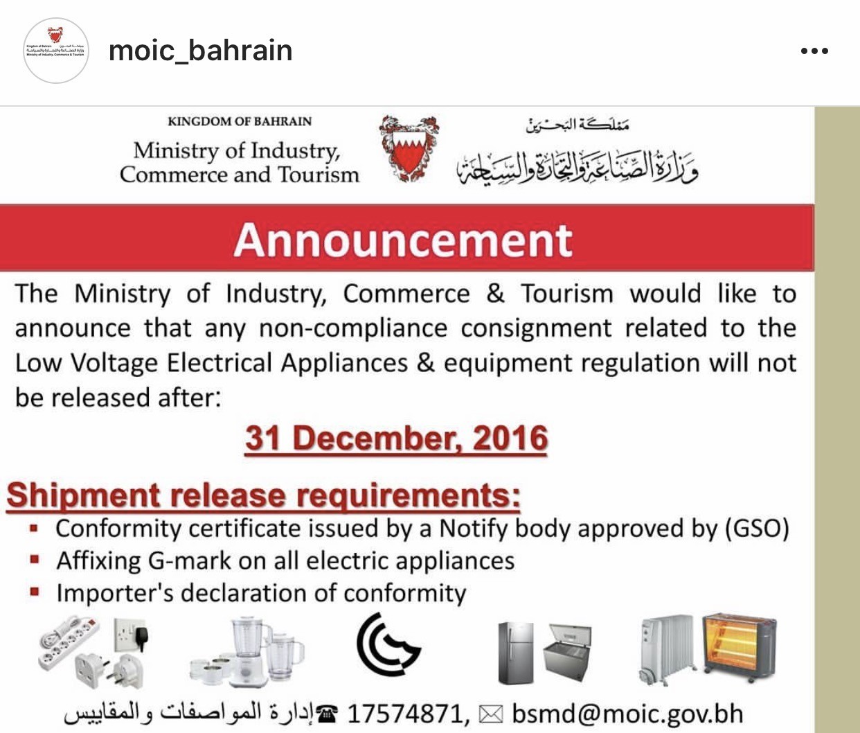 據巴林政府工商及旅游部的通知,從2016年12月31日以后,所有不符合海灣地區低壓電氣設備技術條例的貨物將不被放行。貨品放行需滿足以下要求: