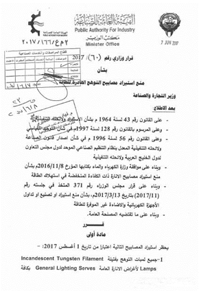 科威特工業管理局(PAI)近期發布了一項有關照明產品的最新指令,該指令涉及內的耗電照明產品(鎢絲燈和等效鹵素燈泡的白熾燈泡等)將禁止出口至科威特,并于2017年8月1日起正式實施。