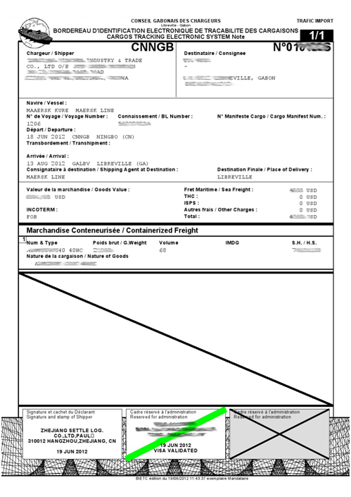 所有發往加蓬(Gabon)的貨物均需申請辦理BIC/CRN,否則將導致船公司無法簽發提單以及目的港無法清關。加蓬BIC貨物跟蹤單也叫加蓬(GabonCRN貨物跟蹤單。